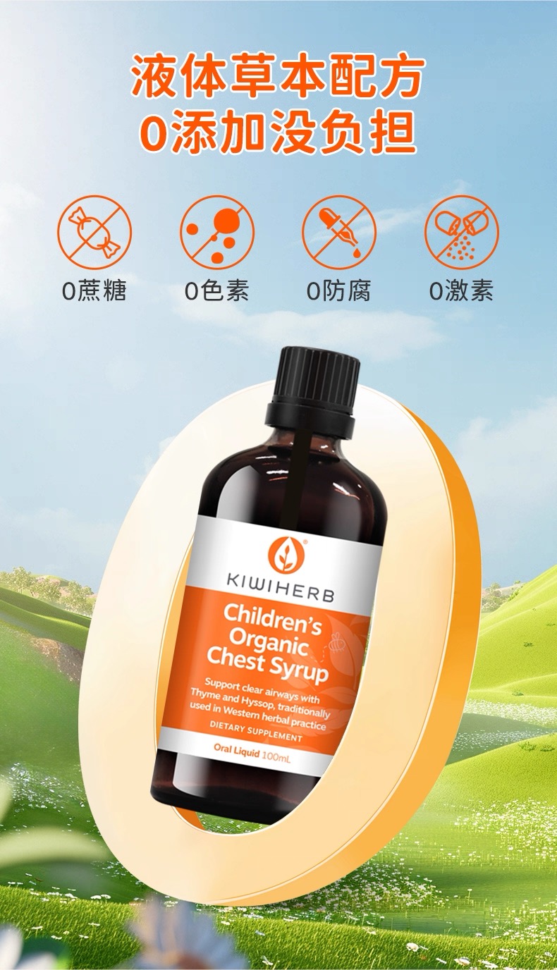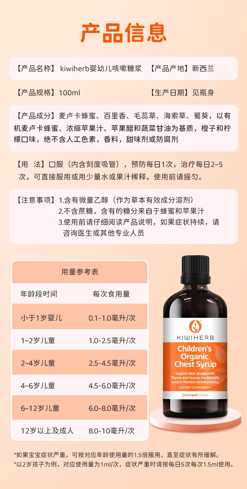 Kiwiherb 百里香+麦卢卡蜂蜜 婴幼儿童止咳清肺糖浆 100ml 参考效期27.12