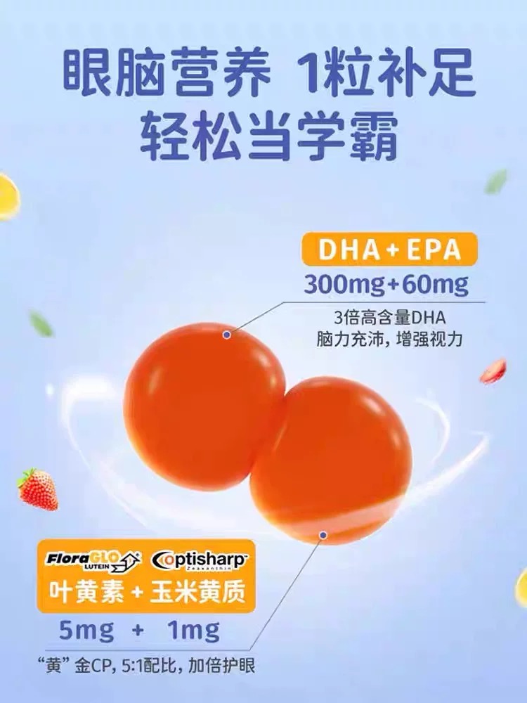 - 1.【高含量DHA/EPA (300mg DHA)】 每片软糖含有300mg DHA 和 60mg EPA,来自优质鱼油。DHA是神经系统和视网膜的重要组成部分,有助于支持大脑功能、认知发展和学习能力。