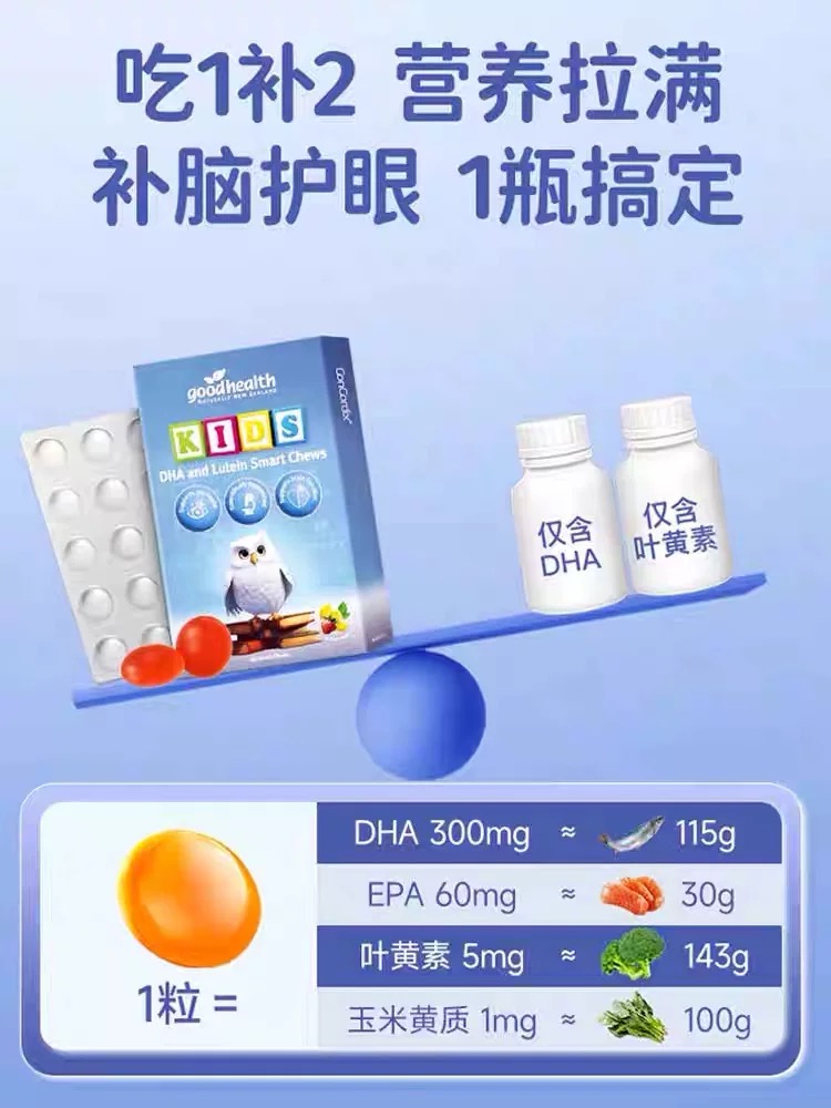 好健康 (Good Health) 儿童DHA+叶黄素软糖 是一款经科学研究配方 的专业营养品,专为支持儿童大脑与眼睛的健康发育 而设计。它将高纯度鱼油DHA与黄金比例叶黄素结合,是孩子成长和“抗蓝光”的理想选择。